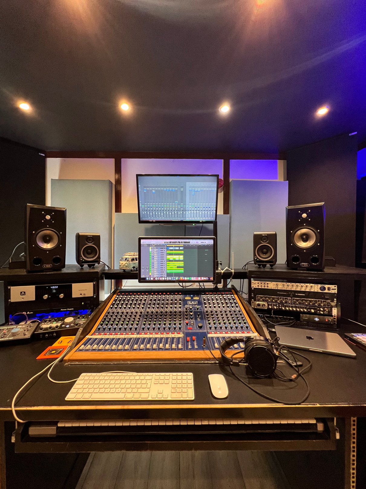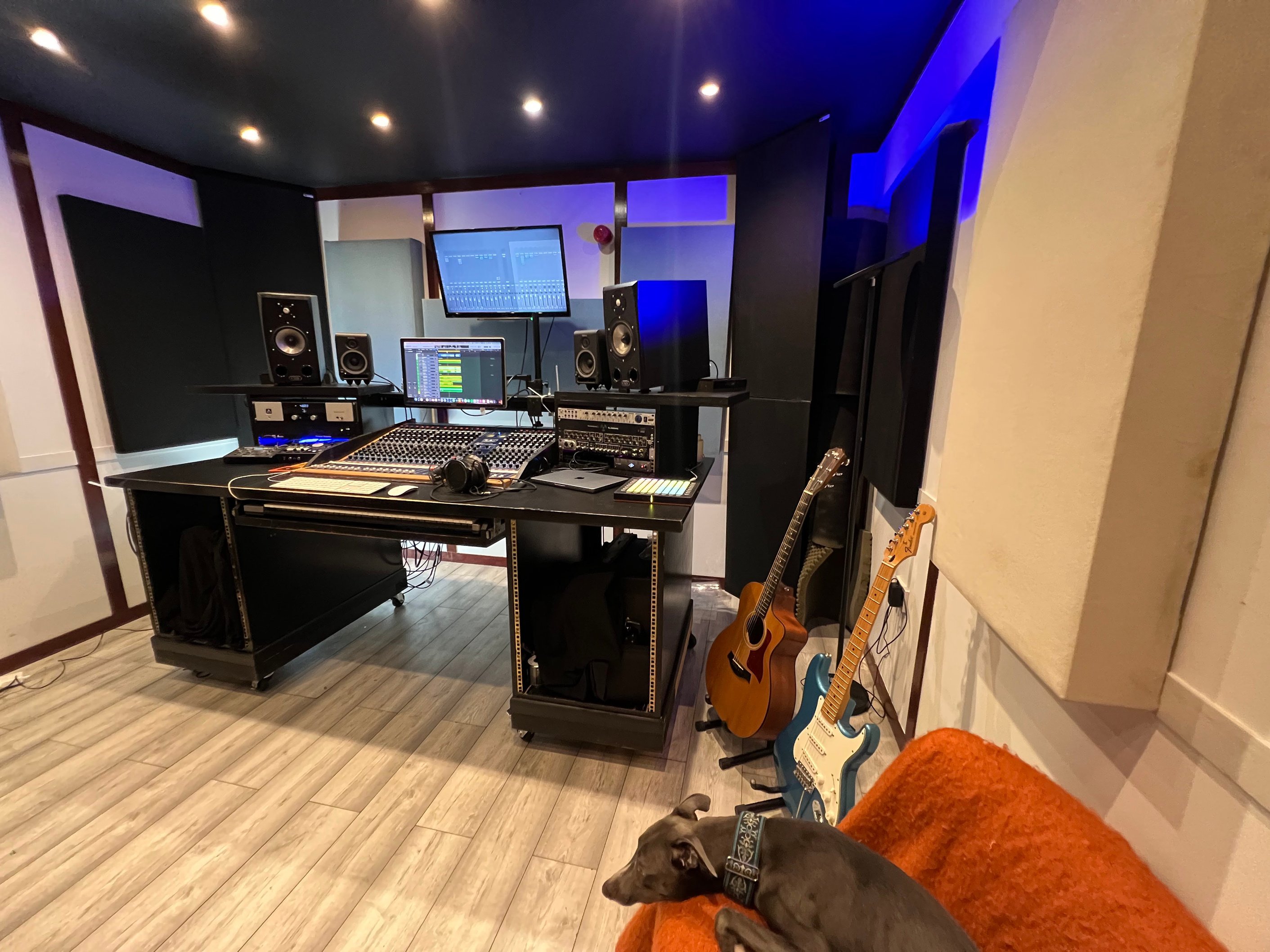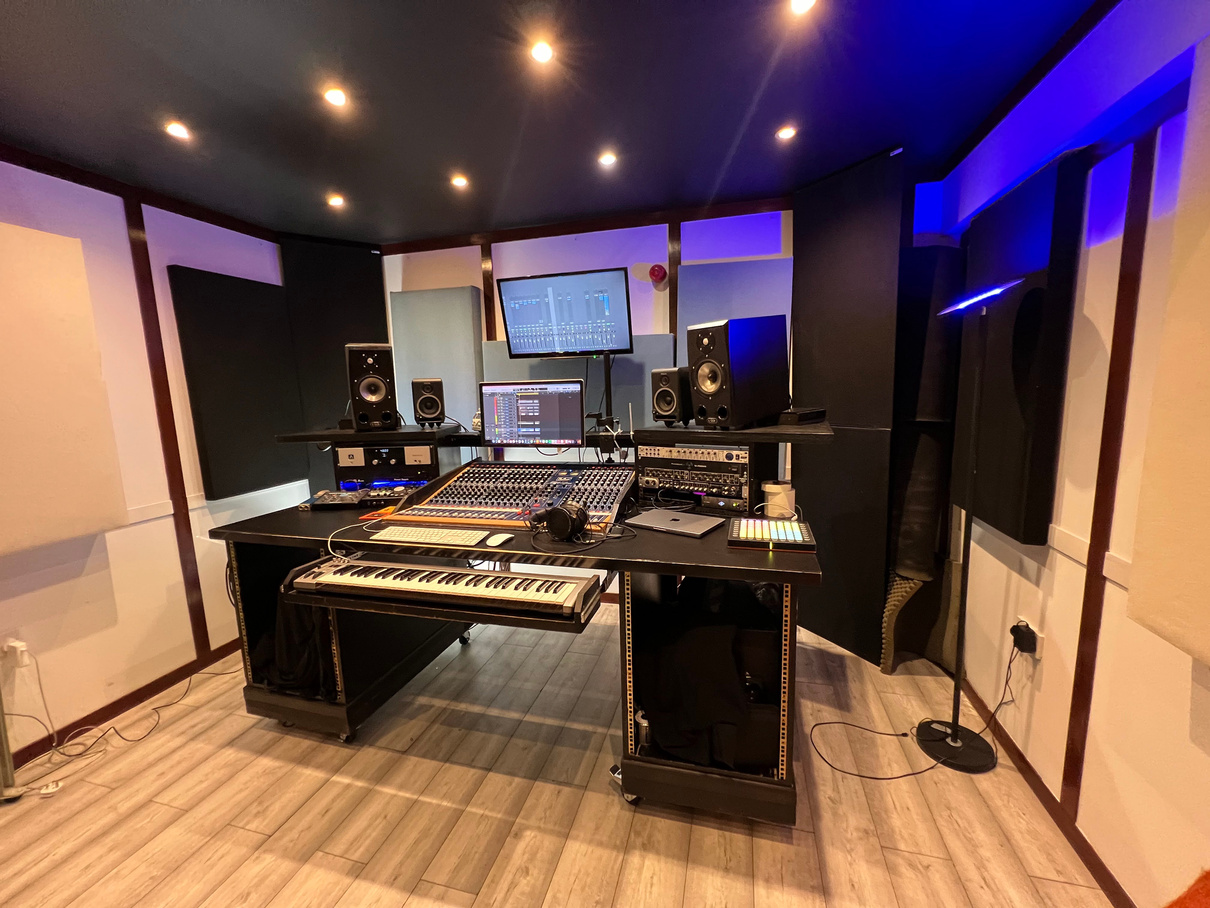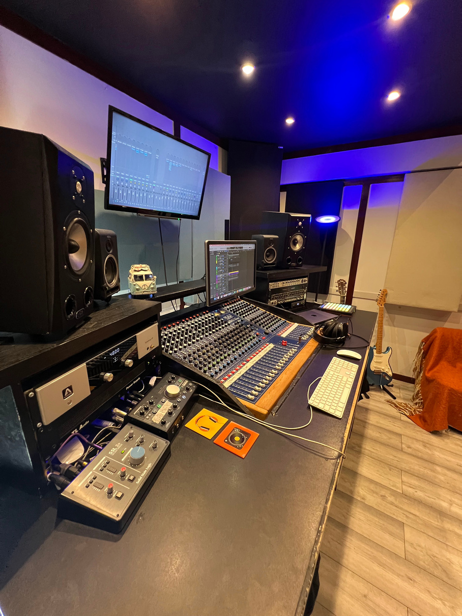 O.S. Acoustics and Focal monitors, SSL interface, TLA analogue desk (available upon request), and a Blue Blueberry mic.